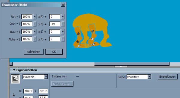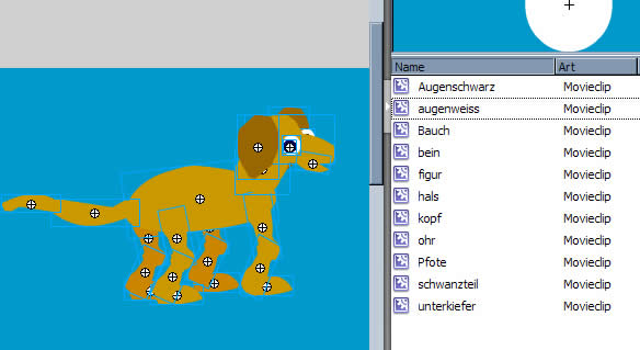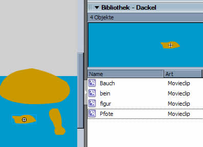 ein ganzes Dackelbein zusammen zustellen. Den zweiten "bein" MovieClip erhältst Du ganz einfach indem Du von "bein" eine zweite Instanz aus der Bibliothek ziehst.