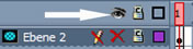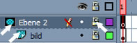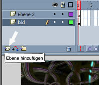 Spiele auch etwas mit dem roten Kreuz unter dem Auge und dem Sicherheitsschloss und beobachte dabei wie die Ansicht unten sich verändert. (Bild 8 oben) Das Sicherheitsschloss ist sehr praktisch, wenn Du auf einer andern Ebene am arbeiten bist und Du verhindern möchtest, dass die gesicherte Ebene auch mit verändert wird. (kann unter Umständen schon einmal passieren ohne dass Du es merkst) Auf das Resultat im swf hat das keinen Einfluss. Du kannst das rote Augenkreuz gut gebrauchen, um die Maske unsichtbar zu stellen, damit Du auf der Ebene darunter unter der Maske arbeiten kannst.