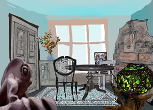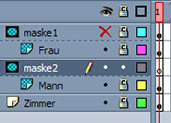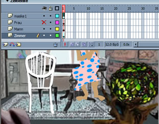 Da Masken im Flash negativmasken sind, müssen beide Masken über das ganze Bühnenbid gehen und nur jeweils die Stuhllehne oder den Tisch aussparen. Du wirst aber trotzdem Problemlos weiterarbeiten können, indem Du die Maskenebenen einfach unsichtbar schaltest wie ich es auf der letzten Seite erklärt hatte.