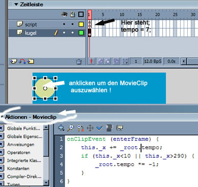 wird schliesslich mit einem logischen Oder || gefragt, ob der Wert _x kleiner als 10 Pixel oder grösser als 290Pixel ist. Ist das der Fall wird auf der Rootzeitleiste die Variable Tempo mal minus 1 gerechnet. Das bewirkt eine umkehr des Vorzeichen. War sie plus wird sie nun Minus und Dein MovieClip wechselt die Richtung nach links. War sie Minus wird sie nun plus und der MovieClip fährt wieder mit Tempo 7 nach Rechts.
