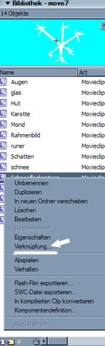 Um jemanden zu rufen, braucht er einen Namen. Bis jetzt haben wir Instanzen von MovieClip angesprochen mit ActionScript. Dazu bekam jede Instanz einen eigenen Namen unten im Eigenschaftsfenster. attachMovie() kann auf keinen InstanzenNamen zurückgreifen, da noch keine Instanz da ist. Der Name in der Bibliothek muss zuerst "freigeschaltet" werden für ActionScrip 2. Dazu klicktst Du in der Bibliothek mit der rechten Maustaste auf den MovieClip, den Du später mit ActionScript auf die Bühne ziehen möchtest. Es geht ein Menu auf (siehe Bild 9 unten)