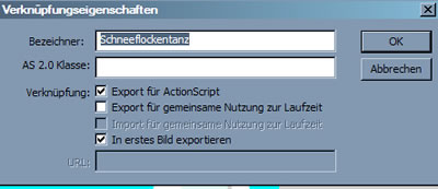 Flash füllt Dir den nötigen Rest selber aus und wählt den Namen den Du dem MovieClip in der Bibliothek gegeben hast auch für den ExportNamen oder vielleicht verständlicher für den Rufnamen. (bild 11 oben)