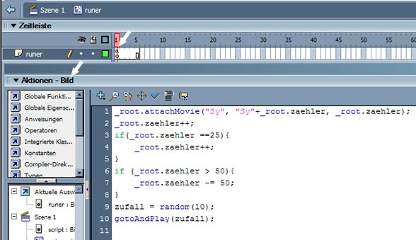 Mit _root.zaehler spreche ich eine Variable an, die ich auf der RootZeitLeiste auf der Ebene "Script" inizialisiert habe. inizialisiert heisst; ich habe sie dort sowohl ins Leben gerufen und ihr auch gleich einen Wert zugewiesen. "Sy"+_root.zaehler ist eine Stringverknüpfung. Ein String ist eine Zeichenkette. Hier wird also der Wert der Variable _root.zaehler als String an den String "Sy" angeknüpft. Wenn der Wert der Variable gerade zum Beispiel 1 war, heisst die neu erzeugte Instanz nun "Sy1".