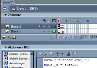 Da der runer ja nur fünf Schlüsselbilder hat. random(5) gibt eine Zahl zwischen 0 und 4. Zählen wir dazu 1 haben wir eine Zahl zwischen 1 und 5. Diese Zahl wird dann der Methode gotoAndPlay(zufall) als Parameter übergeben. Das bewirkt, dass der Loop unterschiedlich lange läuft. Die Flocken erscheinen etwas unregelmässiger, fast wie im realen Leben.