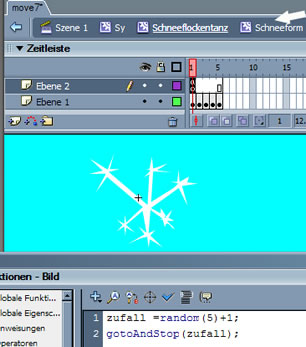 Jetzt habe ich eigentlich alles was da auf der Bühne liegt schon erklärt. Es bleibt noch das Geheimnis der tanzenden Scheeflocken. Und die Tatsache, dass sie so schön verteilt am oberen Bühnen Rand erscheinen. Dazu doppelklicktst Du in der Bibliothek in den MovieClip "Sy"