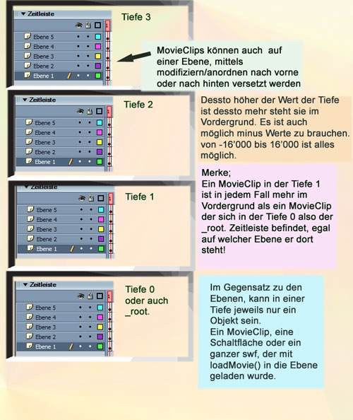 Eine Tiefe in einem 2D Program wie Flash bedeutet letztlich immer entweder hinten oder vorne, sprich verdeckt oder überdeckend. Eine wirkliche Tiefe gibt es in einem 2D Program nicht. Das eine System sind die Ebenen auf der Zeitleiste und das andere eben die sogenannten Tiefen. Dazu kommt eigentlich noch eine drittes System innerhalb einer Ebene selber. Das System der Anordnung. Dies wurde ausführlich im ersten Figuren Tutorial besprochen. MovieClips auf der selben Ebene können in der Tiefe verschoben werden unter modifizieren/anordnen.