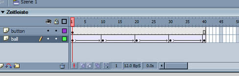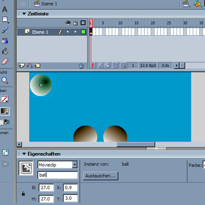 Doch wie sieht es nun aus, wenn Du die Fahrt des Balls in ein MovieClip packst und das ganze in das erste Schlüsselbild der RootZeitLeiste stelltst?