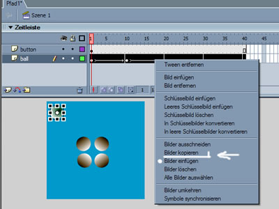 Zuerst markierst Du auf der Ebene "Ball" alle Bilder. Dazu klickst Du ins erste Bild der Ebene und ziehst die schwarze Markierung bis zum letzten Bild. Jetzt klickst Du mit der rechten Maustaste in den schwarzen Bereich. Es geht folgendes Auswahlfenster auf;