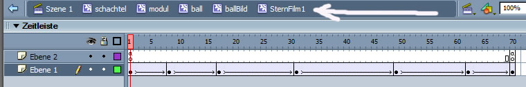 Um in die Verschachtelung hinein zu kommen, doppelklickst Du im geöffneten Fla fünfmal auf den weissen Stern beim Ball. Jedesmal geht eine Verschachtelung mehr auf. Am Schluss kommst Du zur Filminstanz mit Namen "sternFilm1".