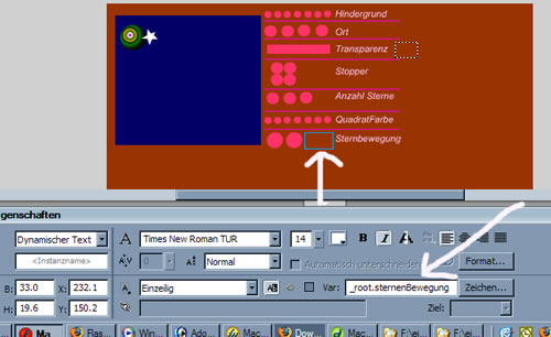 Dazu nimmst Du das Textwerkzeug und schaltest unten im Eigenschaftsfenster das Textfeld auf dynamisch um und bindest es an die Variable _root.sternenBewegung an. (bild 11)