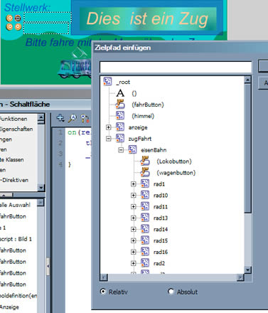 Um zum Beispiel an den Lokobutton heranzukommen, doppelklickst Du zweimal auf die Lokomotive. Beim ersten mal geht der MovieClip "zugFahrt" auf bei zweite Doppelklick geht der movieClip "eisenBahn" auf. Im MovieClip "Eisenbahn" klickst Du die Lokomotie an und siehst nun im ActionScript fenster den Script im Button Lokobutton;
