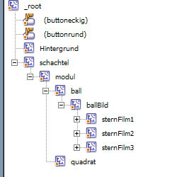 Auf der RootZeitLeiste befinden sich viele Instanzen der zwei Buttoneckig und Buttonrund aus der Bibliothek. In ihnen kannst Du sehen, wie von der RootzeitLeiste aus tief in Verschachtelungen eingegriffen werden kann. In allen Beispielen könntest Du das _root. auch mit this. ersetzen und hättest so statt des absoluten Pfad einen relativen.